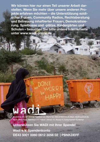 Wadi setzt sich seit mehr als 25 Jahren dafür ein – mit Erfolg, wie die neusten Entwicklungen rund um die Bekämpfung der weiblichen Genitalverstümmelung in Irakisch-Kurdistan zeigen. Hierüber und über weitere Programme möchten wir Sie in diesem Rundbrief informieren, als Nachweis unserer Tätigkeit und in der Hoffnung, weiter Ihre Unterstützung zu finden.