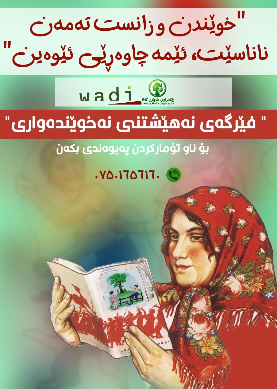 Der Kampf gegen Analphabetismus ist für Wadi nichts Neues. Bereits in den Jahren 1993 bis 1998 führte Wadi in Zusammenarbeit mit dem Bildungsministerium, UNICEF und lokalen Frauenorganisationen eine Alphabetisierungskampagne in den Provinzen Sulaymaniyah und Kirkuk durch. Sie umfasste Städte, Dörfer und Bezirke. Dieser Versuch war eines der erfolgreichen Projekte von Wadi, das den Grundstein für die Bildungsarbeit von Wadi legte.